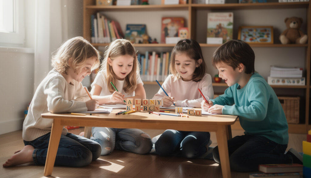 Des jeux simples comme le cadavre exquis, les histoires en chaîne, ou les livres d’images interactifs sont parfaits pour initier les enfants à l’écriture.